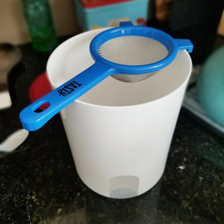 – Place your sifter over the top of your sugar storage container; make sure you are using one that can sit on top of your container without being held.