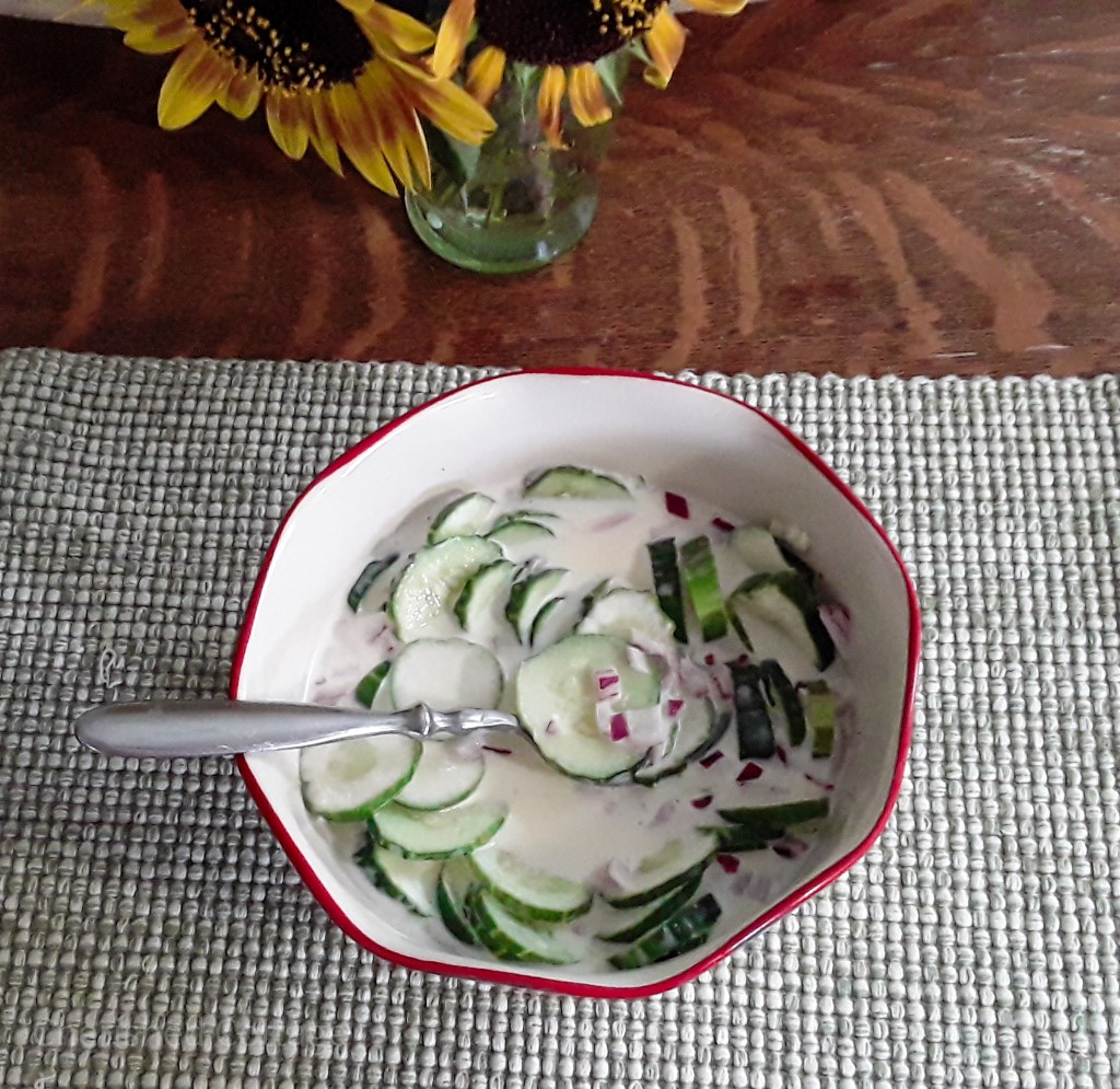 - Cut cucumbers into thin slices (if you don’t like the skin, peel them before slicing), set aside.